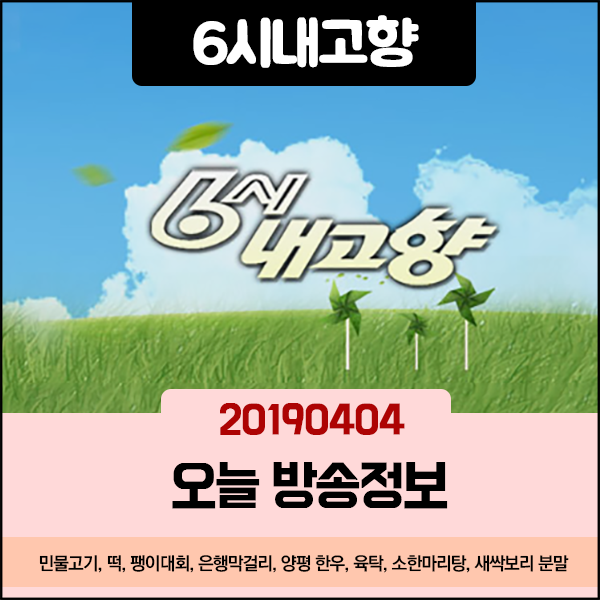 | 6시내고향 20190408 방송정보 기순도 전통장 (전남 담양) 돼지감자 깍두기 (전북 진안) (0) | 2019.04.08 |