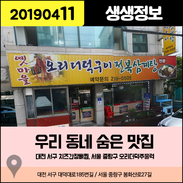 생생정보 20190411 우리 동네 숨은 맛집 - 대전 서구 치즈간장뼈찜, 서울 중랑구 오리더덕주물럭