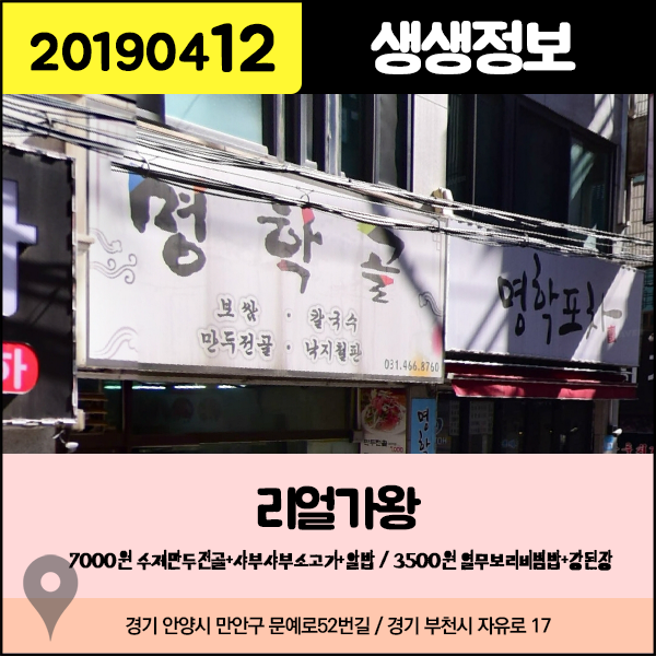 생생정보 20190412 리얼가왕 - 7000원 수제만두전골+샤부샤부소고기+알밥 (경기 안양), 3500원 열무보리비빔밥+강된장 (경기 부천)
