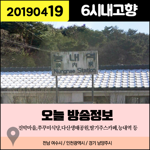 6시내고향 20190419 오늘 방송정보 진막마을 (전남 여수), 쭈꾸미식당 (인천), 다산생태공원 딸기주스카페 능내역 딸기농장 물의정원 딸기마카롱 서양악기박물관 (경기 남양주)
