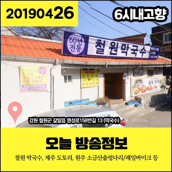 6시내고향 20190426 오늘 방송정보 - 막국수 (강원 철원군), 도토리 (제주 제주시), 소금산출렁다리, 레일바이크 외 (강원 원주시)