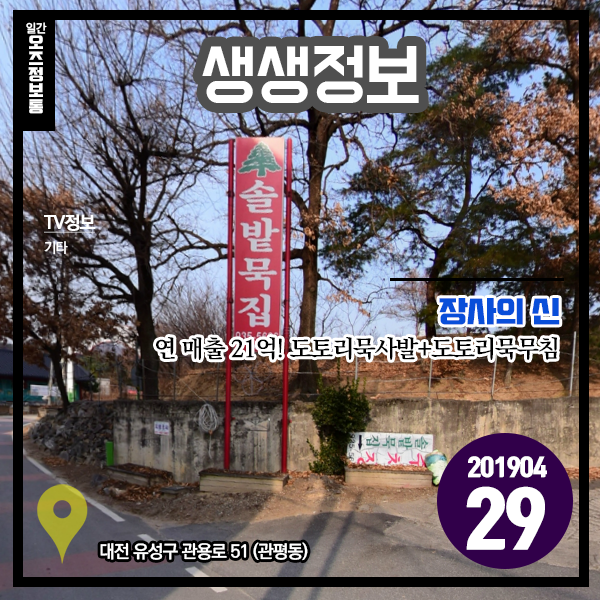 생생정보 20190429 장사의 신 - 연 매출 21억! 도토리묵사발+도토리묵무침 (대전 유성구)