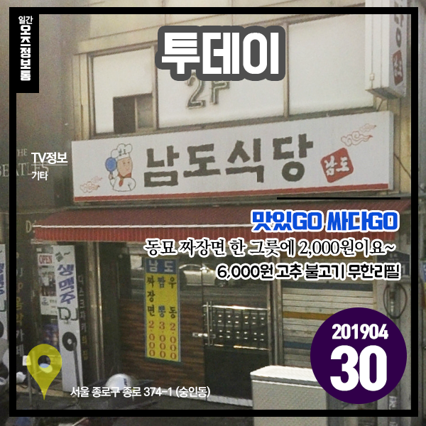 투데이 20190430 맛있GO 싸다GO - 동묘 짜장면 한 그릇에 2000원이요~ 6000원 고추 불고기 무한리필 (서울 종로구, 대구 북구)