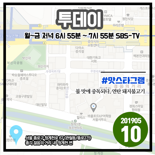 투데이 20190510 #맛스타그램 - 불 맛에 중독되다, 연탄 돼지불고기 (서울 종로구 종로2가 종각 젊음의 거리 청계천 변)
