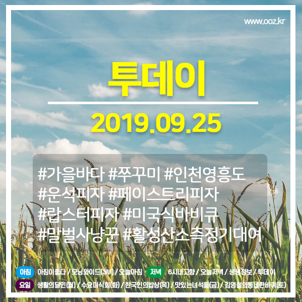 투데이 20190925 (2419) 가을바다,쭈꾸미,인천 영흥도 / 운석피자,페이스트리피자,랍스터피자 / 미국식바비큐 / 말벌사냥꾼 / 활성산소측정기대여업체