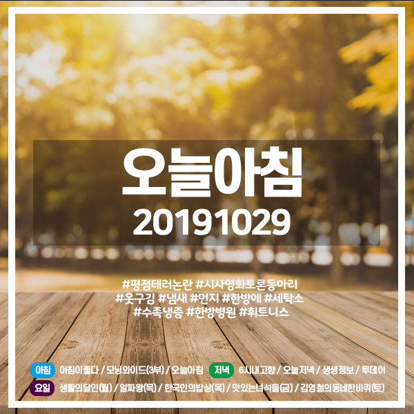 오늘아침 20191029 (3328) 평점 테러 논란 시사영화토론동아리 / 옷구김 냄새 먼지 한 방에 세탁소 / 수족냉증 한방병원 휘트니스