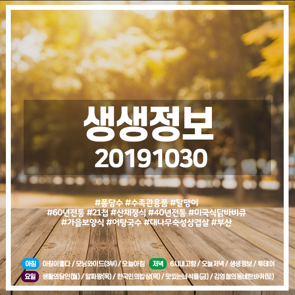 생생정보 20191030 (928) 퐁당수, 수족관용품, 달팽이 / 60년전통 21첩 산채정식, 40년전통 미국식 닭 바비큐 / 가을 보양식 어탕국수, 대나무 숙성 삼겹살 / 부산