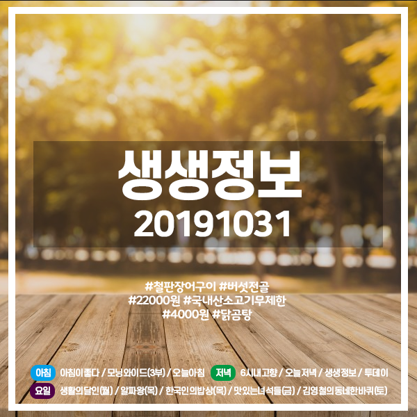 생생정보 20191031 (929) 철판 장어구이, 버섯전골 / 22000원 국내산 소고기 무제한, 4000원 닭곰탕