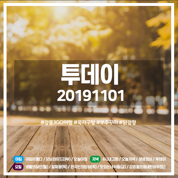 투데이 20191101 (2443) 강릉 3GO 여행-강릉국제영화제,오죽헌,연곡꾹저구탕,강문해변 / #맛스타그램-생부추꾸미 / 인생분식-사랑의 닭강정