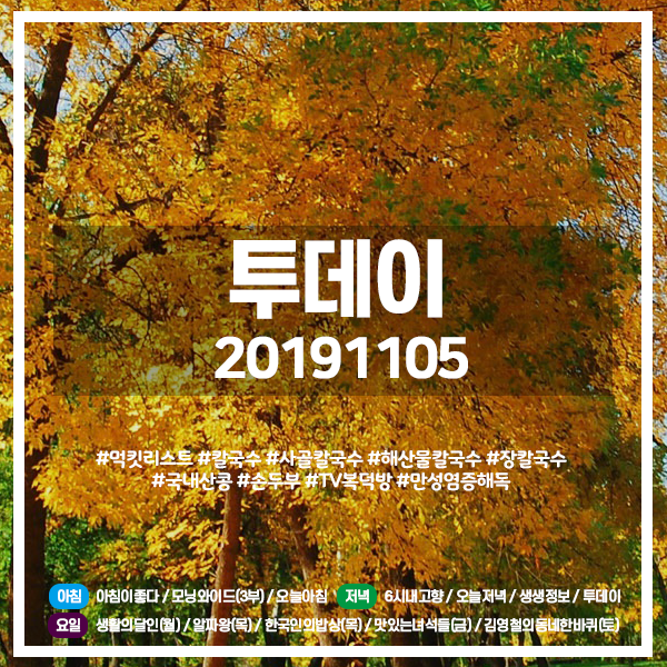 투데이 20191105 (2445) 먹킷리스트 NO.20 칼국수 / 국내산 콩 손두부 / 동갑내기 신혼부부의 첫 러브하우스 / 만성 염증 잡는 해독의 비밀