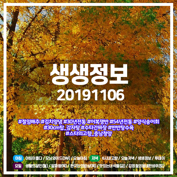 생생정보 20191106 (933) 절임배추,김치양념,포장김치 / 30년전통 어복쟁반, 54년전통 양식송어회 / 30cm탑 감자탕, 수타간짜장&반반탕수육 / 스타의고향-충남 청양