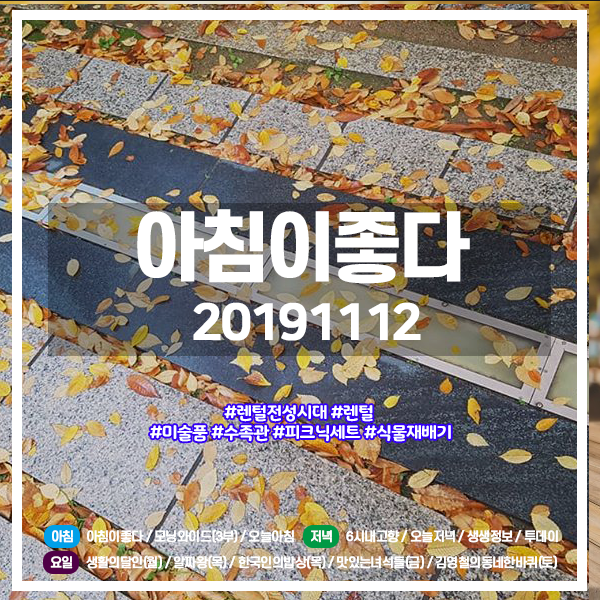 | 아침이좋다 20191111 (883) #포항 구룡포 해풍 국수 / #순천 도시 재생 사업 카페, 복합문화공간 (0) | 2019.11.11 |