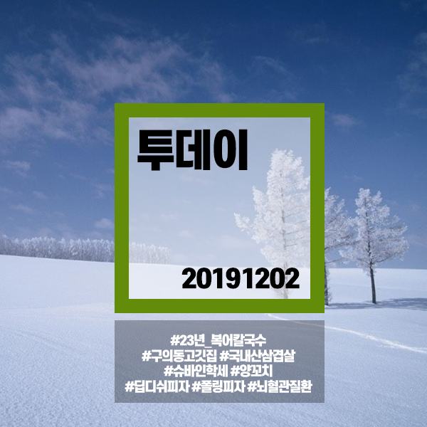 투데이 20191202 (2459) #의왕 23년 복어칼국수 #서울구의 국내산삼겹살 슈바인학세 양꼬치 #서울대학로 딥디쉬피자,폴링피자 / 뇌혈관질환