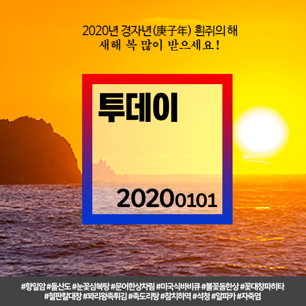 투데이 20200101 (2480) 향일암,돌산도,눈꽃삼복탕,복갈비,문어한상차림,미국식바비큐,불꽃돔한상,꽃대창파히타,철판칼대창,꽈리왕족튀김,족도리탕,참치하역,석청,알파카,자죽염