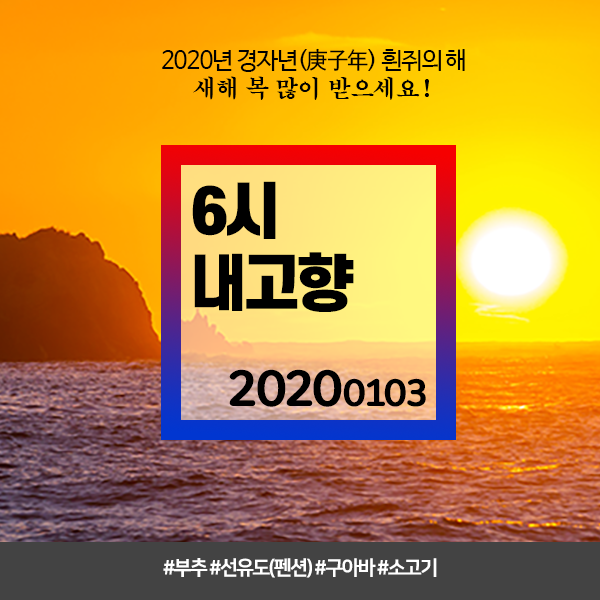 | 6시내고향 20200101 (6937) #경남산청 흰딸기 #부산 아귀 #전남고흥 쑥섬 #충남보령 굴식당 (0) | 2020.01.01 |