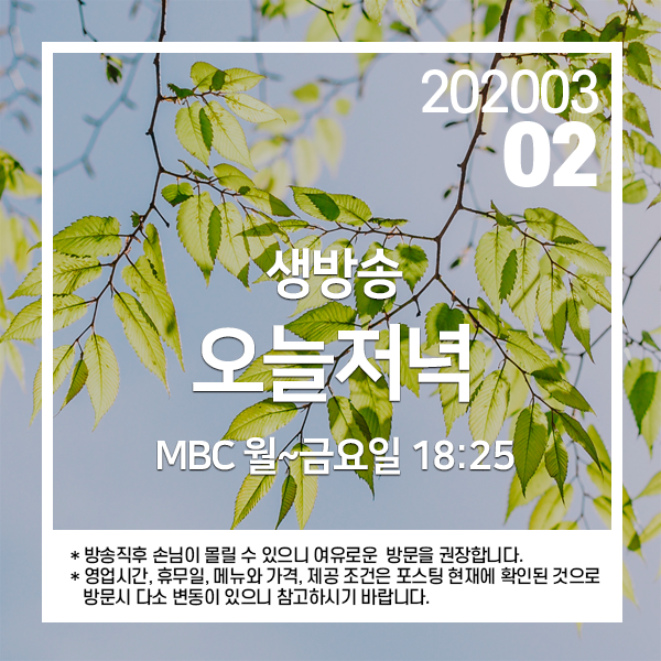 2020년 3월 2일 MBC 생방송 오늘저녁 1267회에 소개된 곳입니다.