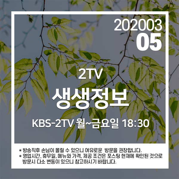 2020년 3월 5일 KBS-2TV 생생정보 1018회에 소개된 곳입니다.