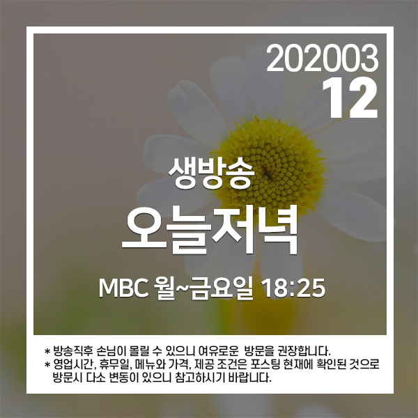 2020년 3월 12일 MBC 생방송 오늘저녁 1275회에 소개된 곳입니다.