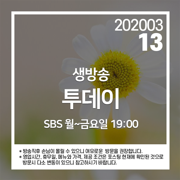 2020년 3월 13일 SBS 생방송 투데이 2530회에 소개된 곳입니다.
