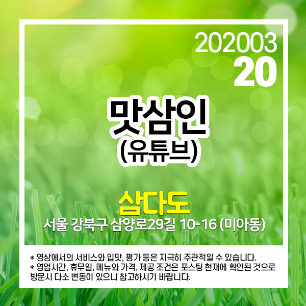 2020년 3월 20일 유튜브 맛삼인 채널에 소개된 곳입니다.