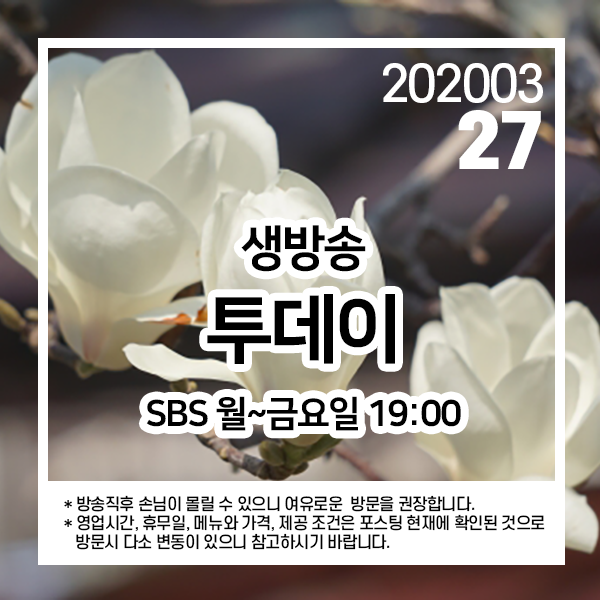 2020년 3월 27일 SBS 생방송 투데이 2540회에 소개된 곳입니다.