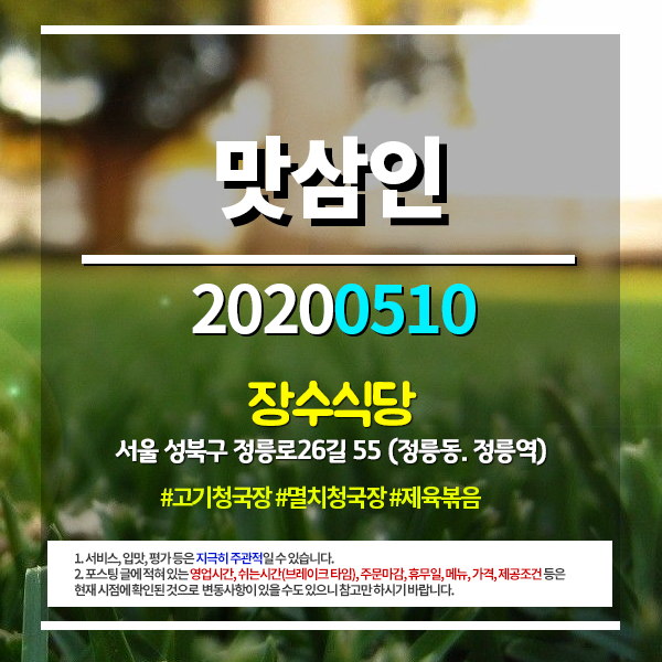 맛삼인(유튜브) 20200510 #정릉동 #정릉역 #장수식당 #고기청국장 #멸치청국창 #제육볶음