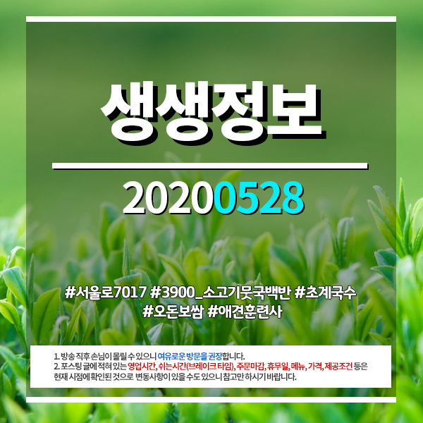 생생정보 20200528 (1077) #서울로7017 #3900_소고기뭇국백반 #초계국수 #오돈보쌈 #애견훈련사
