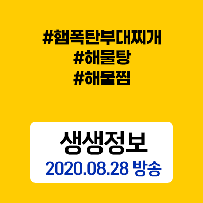 | 생생정보 제철 활어회,단호박꽃게탕(인천 강화도) 망치고기(남양주 평내호평역) (0) | 2020.08.26 |