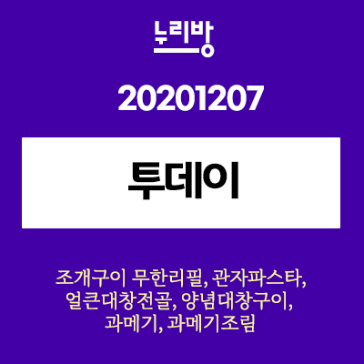 투데이 조개구이 무한리필, 관자 파스타 (경기 시흥) 얼큰 대창 전골 (서울 성신여대입구역) 양념 대창구이 (서울 건대입구역), 과메기, 과메기조림 (경북 포항 구룡포)