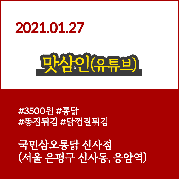 맛삼인(유튜브) 20210127 통닭한마리 3500원, 똥집튀김, 닭껍질튀김 - 국민삼오통닭 신사점 (서울 응암역,은평구 신사동)