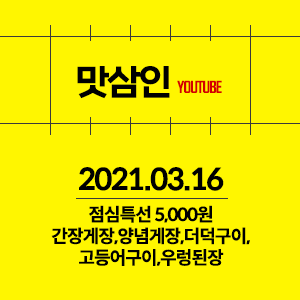 2021년 3월 16일 맛삼인 (유튜브) 점심특선 5,000원 간장게장,양념게장,더덕구이,고등어구이,우렁된장 - 우경촌 (서울 불광동,연신내역)