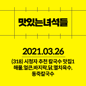 2021년 3월 26일 맛있는 녀석들 (318) 시청자 추천 칼국수 맛집 (1) - 해물칼국수,얼큰칼국수,바지락칼국수,닭칼국수,멸치육수칼국수,동죽칼국수
