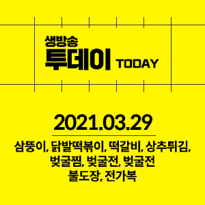 2021년 3월 29일 생방송 투데이 삼뚱이,닭발떡볶이,떡갈비,상추튀김 (광주광역시) 벚굴찜,벚굴전,벚굴죽 (전남 광양) 불도장 (서울 서래마을) 전가복 (서울 마포역)