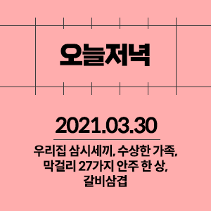 2021년 3월 30일 오늘저녁 우리집 삼시세끼,수상한 가족, 막걸리 27가지 안주 한 상, 갈비 삼겹 (전북 전주)