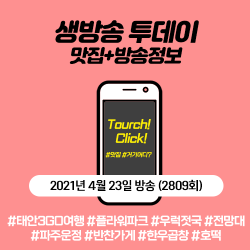 2021년 4월 23일 생방송 투데이 - 태안 3GO여행 (코리아플라워파크, 우럭젓국, 태배전망대), 파주운정 반찬가게, 한우곱창, 평택 사랑의 호떡