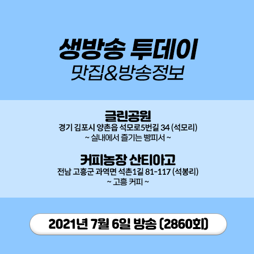 20210706 생방송 투데이 (2860) 빵피서-김포카페 고흥-고흥커피 안면도-2층 탑 용궁철판 청담-하나뿐인 메밀국수