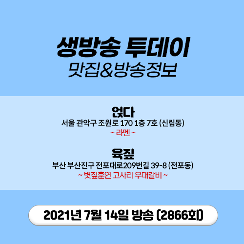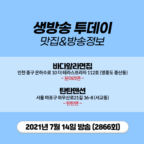 20210714 생방송 투데이 (2866) 인천 소야도 농어회 농어맑은탕 선상낚시 용궁라면 문어라면 탄탄면 라멘 볏집훈연 고사리 우대갈비 방짜유기