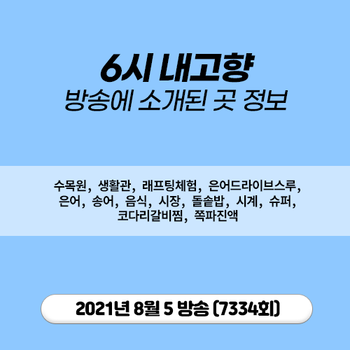 20210805 6시 내고향 (7334) 수목원, 생활관, 래프팅체험, 은어드라이브스루, 은어, 송어, 음식, 시장, 돌솥밥, 시계, 슈퍼, 코다리갈비찜, 쪽파 진액