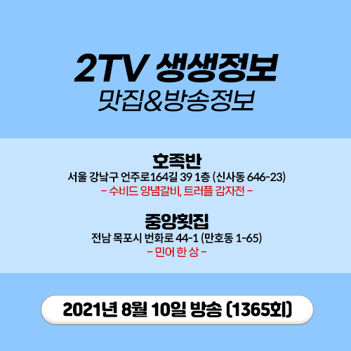 20210810 2TV 생생정보 (1365) 서울 언주로164길) 수비드 양념갈비, 트러플 감자전 / 전남 목포) 민어 한 상