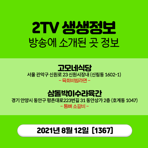 20210812 2TV 생생정보 (1367) 서울 신림동 신원시장-육회비빔라면, 경기 안양 범계역-통뼈 소갈비, 경남 고성-갯장어 한 상, 목청