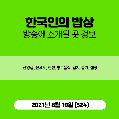 20210819 한국인의 밥상 (524) 이열치열 - 구이의 재발견 (산양삼, 선유도 펜션, 향토음식, 김치, 옹기, 캠핑)
