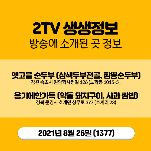 20210826 생생정보 (1377) 삼색두부전골,짬뽕순두부 (강원 속초) , 약돌돼지구이,사과쌈밥 (경북 문경)