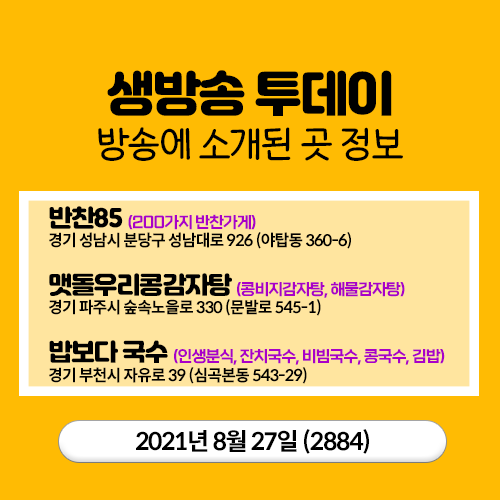 20210827 생방송 투데이 (2884) 담양 3GO여행 , 200가지 반찬 (경기 성남) , 콩비지감자탕,해물감자탕 (경기 파주) , 잔치국수,비빔국수,콩국수 (경기 부천)