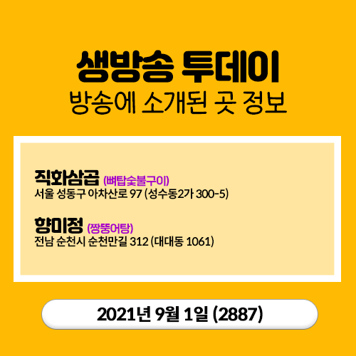 20210901 생방송 투데이 (2887) 인천 덕적도 (우럭건작탕, 간자미회무침, 선상낚시) , 오천만의 여름 보양식 - 전복 , 뼈탑숯불구이, 짱뚱어낚시,짱뚱어탕