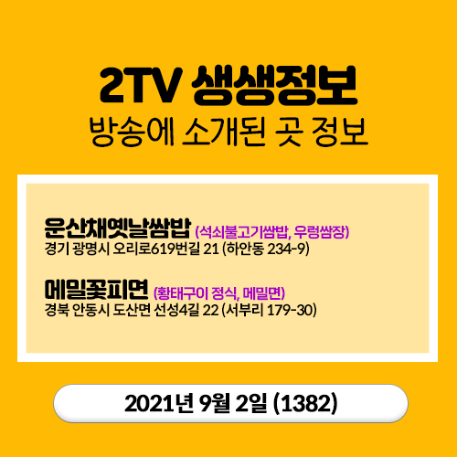 | 20210903 생생정보 (1383) 고추 뼈찜, 새우튀김, 물회국수, 비빔회국수, 회덮밥, 36년 전통 삼색 장어구이, 청주 여행 (0) | 2021.09.03 |
