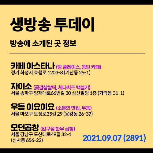 20210907 생방송 투데이 (2891) 빵플레이스-동탄카페, 곶감찹쌀떡, 체다치즈 백설기-송파구 핫플레이스 떡집, 우동 찐맛집, 압구정 한우 곱창