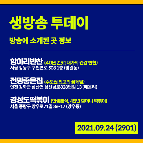 20210924 생방송 투데이 (2901) 홍성 3GO 여행, 40년 손맛 건강 반찬 (서울 명일동,고덕역), 꽃게탕 (인천 강화), 45년 할머니 떡볶이 (서울 망우동,양원역)