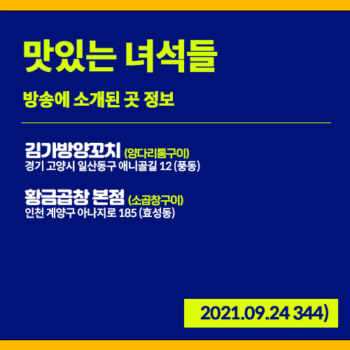 20210924 맛있는 녀석들 (344) 양다리통구이 (경기 고양 풍동), 소곱창구이 (인천 계양 효성동)