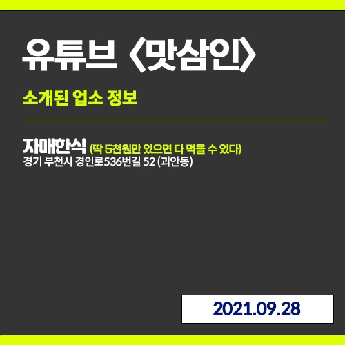 20210928 유튜브 <맛삼인> 딱 5천원만 있으면 다 먹을 수 있다! - 자매한식 (경기 부천 괴안동, 역곡역)
