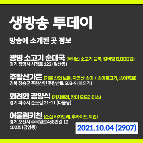 20211004 생방송 투데이 (2907) 국내산 소고기가 듬뿍! 갈비탕 6000원, 송이불고기, 송이육회, 카차토레, 장미 오므라이스, 후라이드 치킨